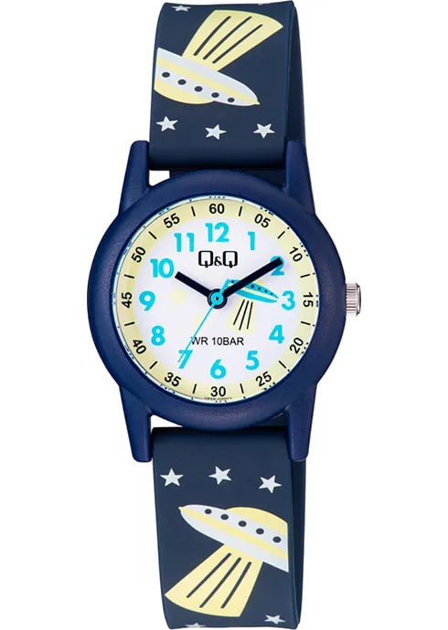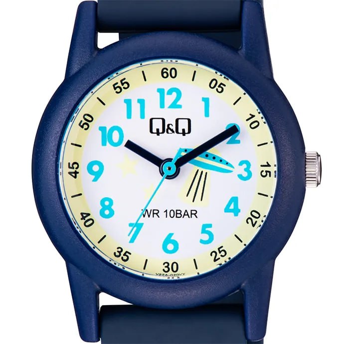 ساعت مچی کیو اند کیو V22A-020VY بچگانه، یک ساعت اسپرت با تم فضایی و بسیار سبک است. این مدل با قطر ۳۲ میلیمتری و بند سیلیکونی ضد حساسیت، کاملاً برای مچ کودکان طراحی شده است. مجهز به موتور کوارتز ژاپنی بوده و مهمترین ویژگی آن ضدآب بودن تا عمق ۱۰۰ متر است که آن را برای استخر و بازیهای آبی ایدهآل میکند.